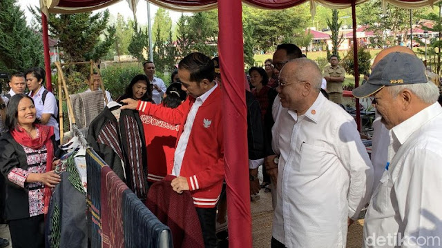 Jokowi melihat-lihat jaket yang dijajakan. Dia memegang satu jaket kain ulos warna merah yang kemudian dia berikan ke Menteri PUPR Basuki Hadimuljono. "Ini Pak, beli. Bayar loh ya," kata Jokowi ke Basuki.