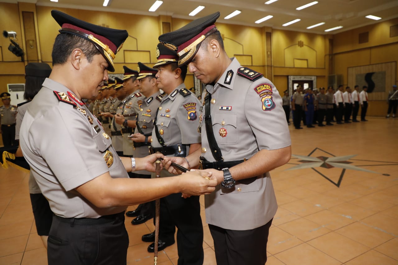 | Kapolda Sumut Irjen Pol Agus Andrianto, SH, MH ketika menyematkan tanda jabatan. |