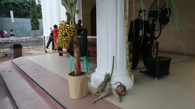 Terlihat di depan pintu masuk gereja Panitia Pesta Gotilon memajangkan hasil panen antara lain pohon pisang beserta buahnya, ubi kayu, nenas dan hasil tani lainnya, di depan altar gerejapun hal yang sama dipajangkan.